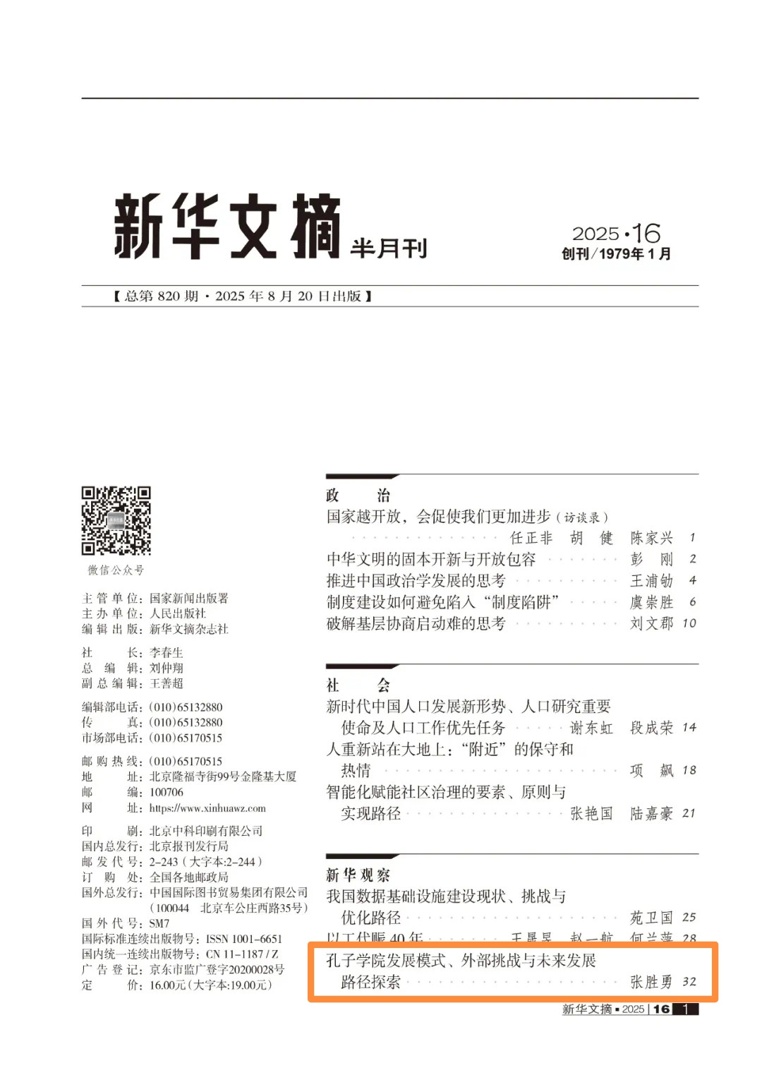 2025年第16期《新华文摘》全文转载BB电子游戏官网外国语学院张胜勇副教授撰写的《孔子学院发展模式、外部挑战与未来发展路径探索》一文。该论文原发于CSSCI来源期刊《四川师范大学学报(社会科学版)》。论文从区域国别学视角出发,聚焦孔子学院的现有发展模式,重点分析其协同发展、数字化赋能、特色化发展、海外中文教育体系和标准化建设。论文指出孔子学院面临着复杂的社会环境、负面舆情、人员派出难等挑战,孔子学院应通过扩展“中文+职业技能”影响边界、持续优化生态圈、制定本土化发展策略、发展国别研究和建设高端智库等措施进行积极应对。 《新华文摘》由国家新闻出版署主管、人民出版社主办,是大型理论性、综合性、资料性文摘类权威期刊,是我国学术界公认的权威二次文献之一,具有较高的学术地位和广泛的影响力。能被其全文转载的文章,通常被认为是该学科领域的重要成果,其学术价值等同于在顶级期刊发表的论文。